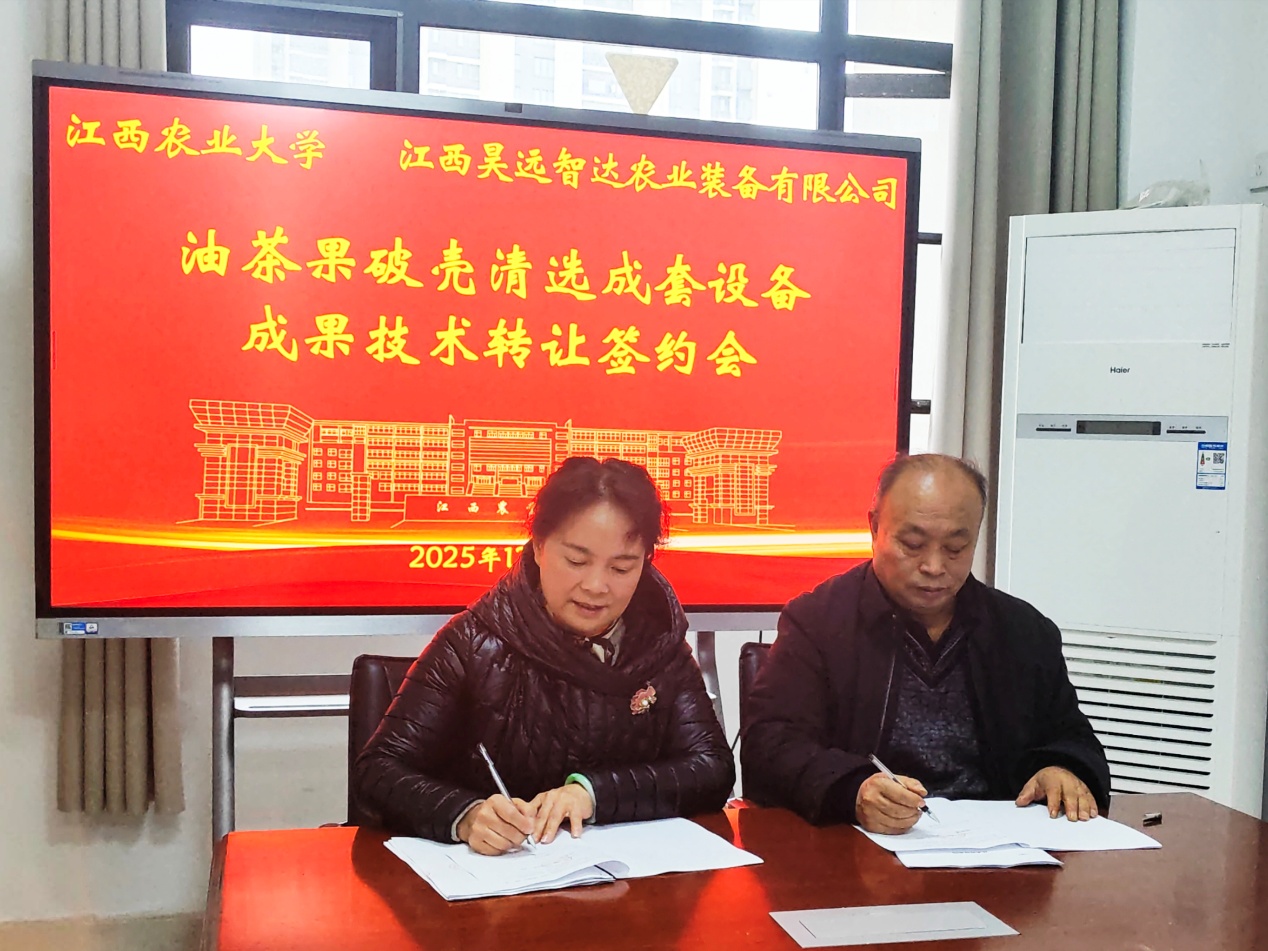 12月24日,学校自主研发的“油茶果破壳清选设备”技术成果转让签约仪式在科技大楼举行。工学院胡淑芬副教授代表技术研发团队与江西昊远智达农业装备有限公司签订转让协议,转让金额为180万元,这标志着该装备技术迈向产业化应用阶段,将为江西省油茶产业高质量发展提供有力装备支持。