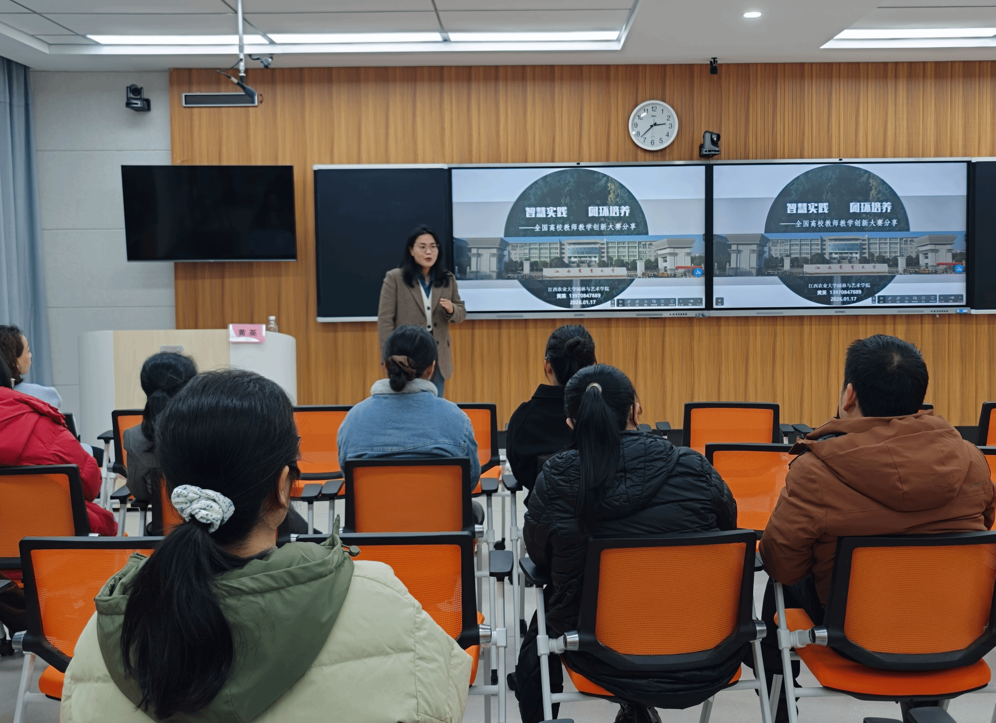 本次交流会特邀我校教创赛国赛一等奖获得者黄英副教授作专题分享。黄英老师结合自身参赛经验及丰富的赛事评审指导经历,围绕教创赛赛事解读、创新成果报告撰写的关键要点等核心内容展开系统讲授,并通过典型案例剖析,清晰指出备赛过程中常见问题及改进方向。互动交流环节,在场教师聚焦备赛难点踊跃提问,黄英老师逐一细致解答并给出指导建议,现场交流氛围浓厚。