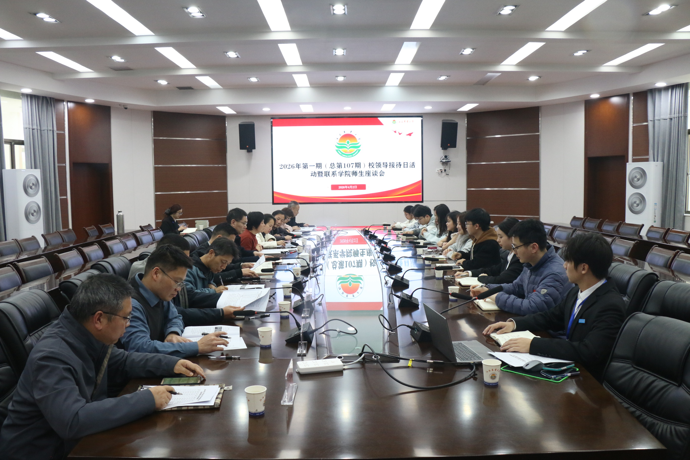 为深入开展树立和践行正确政绩观学习教育,畅通师生沟通渠道、回应师生关切,凝聚办学合力,4月2日,学校在校办二楼圆形会议厅举行2026年第一期(总第107期)校领导接待日活动暨联系学院师生代表座谈会。副校长王文君出席会议,党务政务督查室、学工处、团委、教务处等相关单位负责人,林学院、计信院师生代表及学生校长助理代表参加会议。